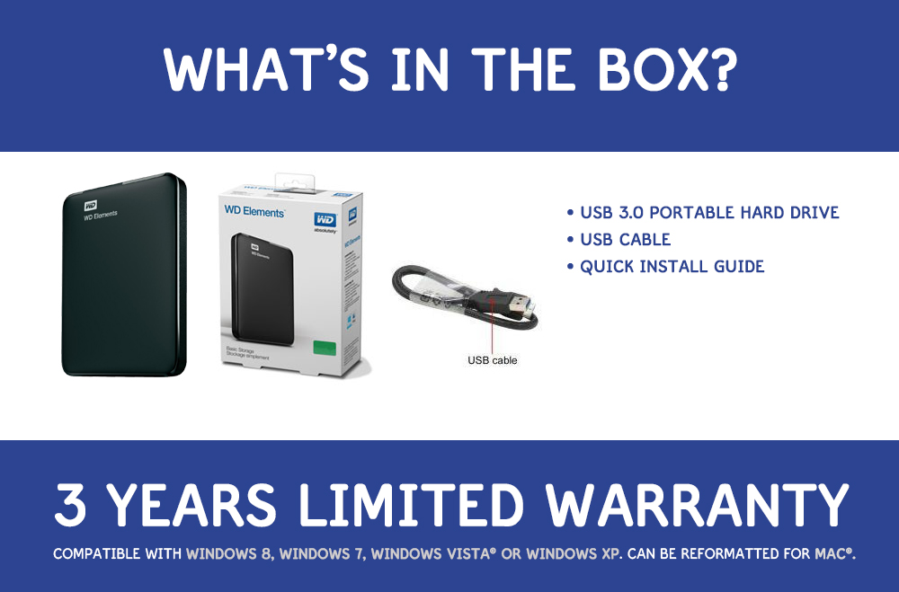 Included Components – USB 3.0 Portable Hard Drive, USB Cable and Quick Install Guide